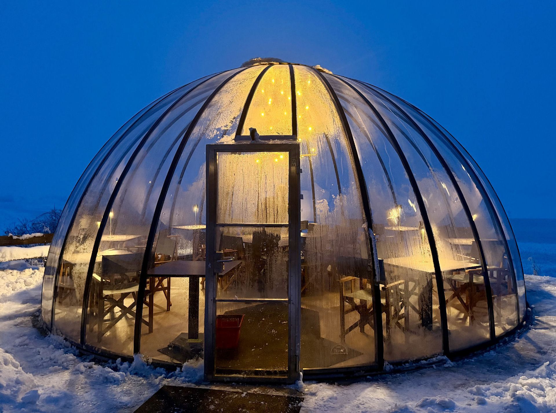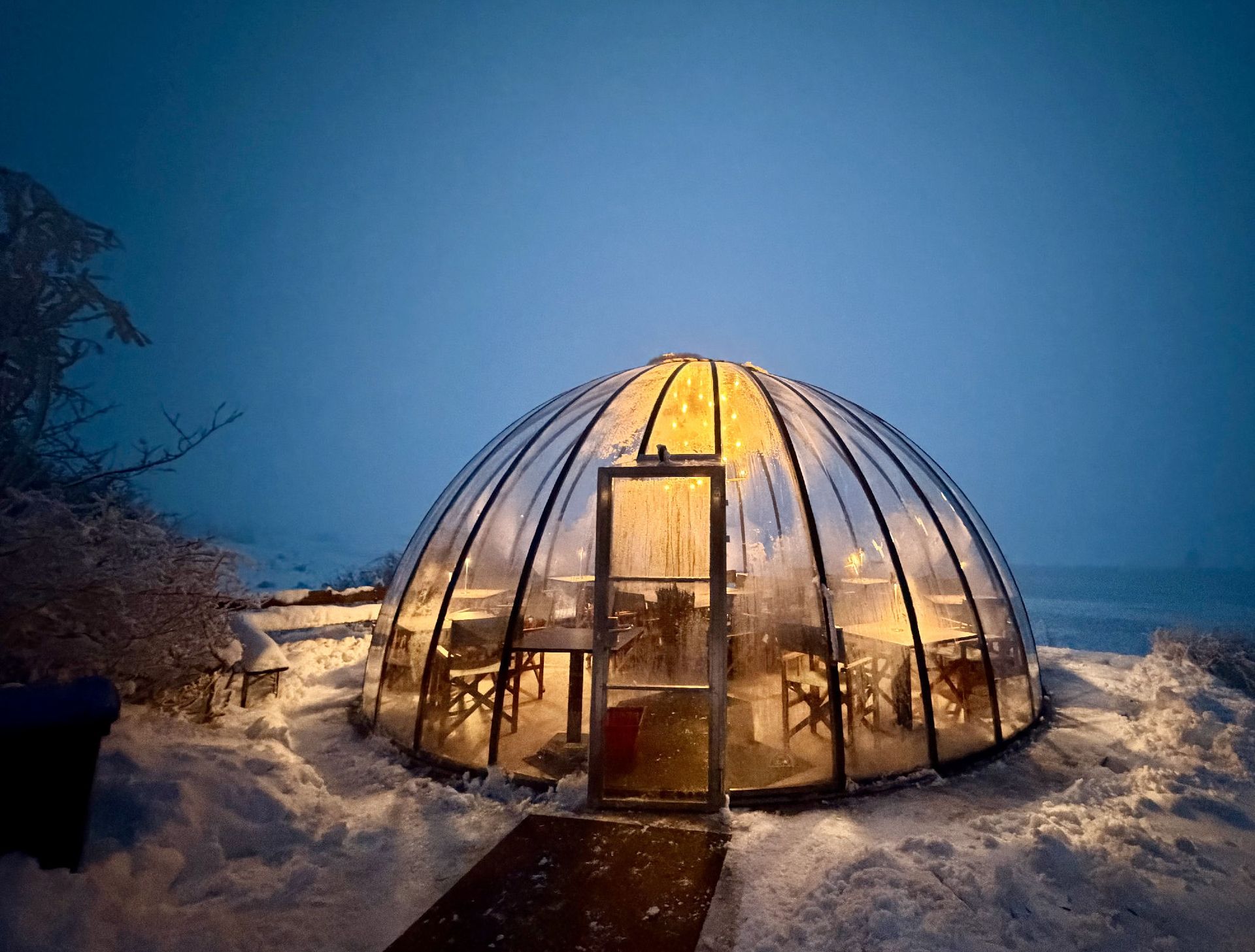 Diese wunderbare Location ist beheizt und somit im Winter kuschelig warm, im Sommer kann die Kuppel komplett aufgeschoben werden.